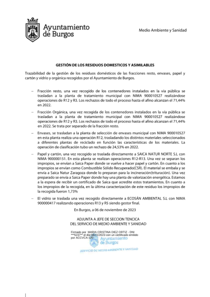 Trazabilidad de la gestión de los residuos domésticos de las fracciones resto, envases, papel y cartón y vidrio y orgánica recogidos por el Ayuntamiento de Burgos.