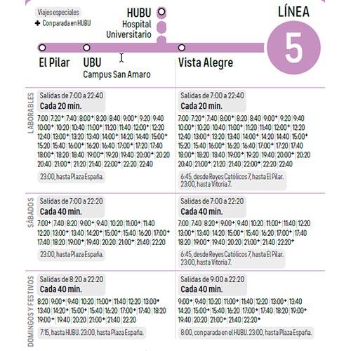 Línea 5: Barrio El Pilar - UBU - HUBU - Vista Alegre Itinerario Icono Mapa Consulta el Itinerario en Directo Horario Documents LINEA_05.pdf (pdf 37,8 kB)