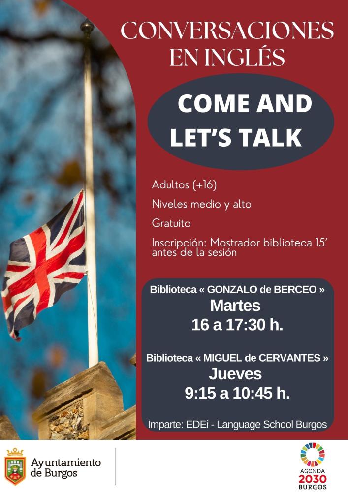 Damos la bienvenida al nuevo curso con nuestras sesiones de conversaciones en inglés "Come and let's talk". Tendrán lugar todos los martes (exceptuando los festivos) en la Biblioteca «Gonzalo de Berceo» de 16:00 a 17:30 h.