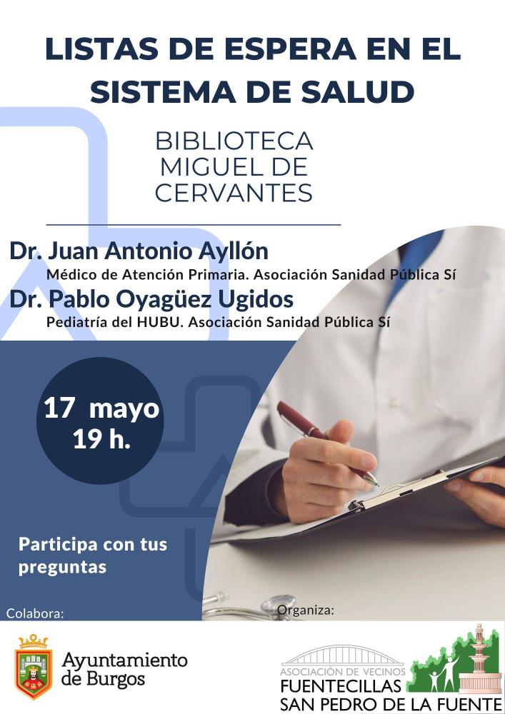 El miércoles 17 de mayo a las 19:00h en la Biblioteca «Miguel de Cervantes» los doctores Juan Antonio Ayllón, -Médico de Atención Primaria- y Pablo Oyagüez Ugidos, -Pediatra del HUBU, ofrecerán la charla-coloquio Listas de espera en el Sistema de Salud que organiza la Asociación de Vecinos Fuentecillas -San Pedro de la Fuente