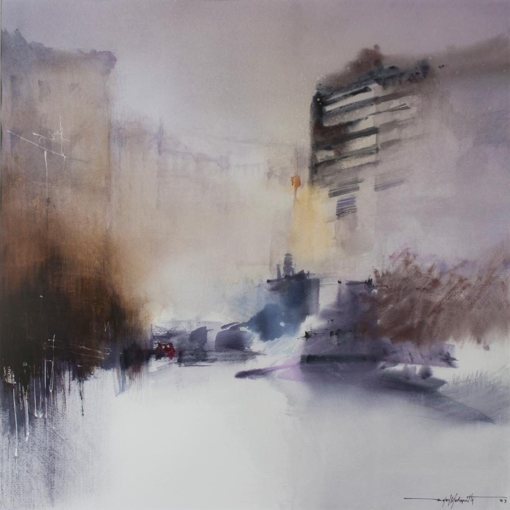 Esa magnífica estampa urbana es trasunto de las urbes de Rafa Mediavilla. La panoplia de vistas de ciudades, reconocibles algunas, escondidas otras, envueltas en brumas, nubes o lluvia racheada, son la constante de sus ciudades. Aparentemente inacabados acrílicos y acuarelas, de colores medidos, cuando no lavados, muestran una maestría en la técnica pareja a la capacidad creativa. El pintor, conocedor de esa tradición de la ciudad como objeto del arte de la que venimos hablando, estudioso de cuantos le precedieron, sin dejar de ser deudor de la tradición, no pretende repetir ni repetirse, y nos aporta bellas estampas cargadas de misterio y profundidad. Aquí una cúpula, allá un torreón o el trasunto de un canal, con esas ventanas de construcciones que se nos antojan desiertas o, al menos, cuyos habitantes no asoman apenas por no romper, con su ruido, la serenidad reinante. Complemento de todas ellas es el efecto “teleobjetivo”, la acumulación de planos en un único contorno, de suerte que no hay rotundidad, sino luz y sombra, materia en regresión frente a la sensación que es lo que nos llega. Esa es la maestría de Mediavilla: de la materia a la sensación, rotos los límites del cuadro, como muchas veces lo hace, rompe a su vez nuestra distancia con lo representado, que es un lugar lejano, pero, mágicamente, nos adentramos en su atmósfera. Pintar la atmósfera, el aire, la vieja aspiración del pintor barroco. Malévich decía que “para los impresionistas la luz era el elemento de la sensación del mundo. Les era totalmente indiferente si ella reproducía o no la forma”. Así es la obra de Mediavilla: la luz es la razón de ser. La forma, cuando es, no es sino consecuencia.