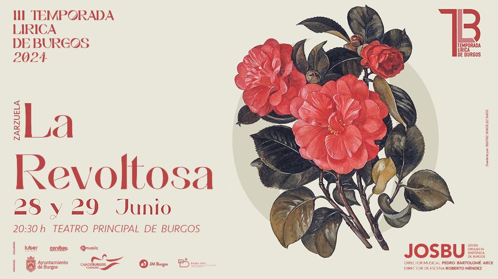 Viernes 28 y sábado 29 de junio de 2024. 20:30 h. FIESTAS DE S. PEDRO Y S. PABLO. III TEMPORADA LÍRICA DE BURGOS. ZARZUELA. “La Revoltosa” (Música: Ruperto Chapí. Libreto: José López Silva y Carlos Fernández Shaw). Joven Orquesta Sinfónica de Burgos. Orfeón Burgalés (directora: Marta Pilar Hernando). Ballet Antología (directora: Mayte González Bayona). Dirección de escena: Roberto Méndez. Dirección musical: Pedro Bartolomé Arce. Teatro Principal de Burgos. Zona A: 25 €, Zona B: 20 €, Zona C: 12,5 €, Zona D: 10 € (+ comisión de venta por internet). Programación conjunta Ayuntamiento de Burgos y Fundación Caja de Burgos.